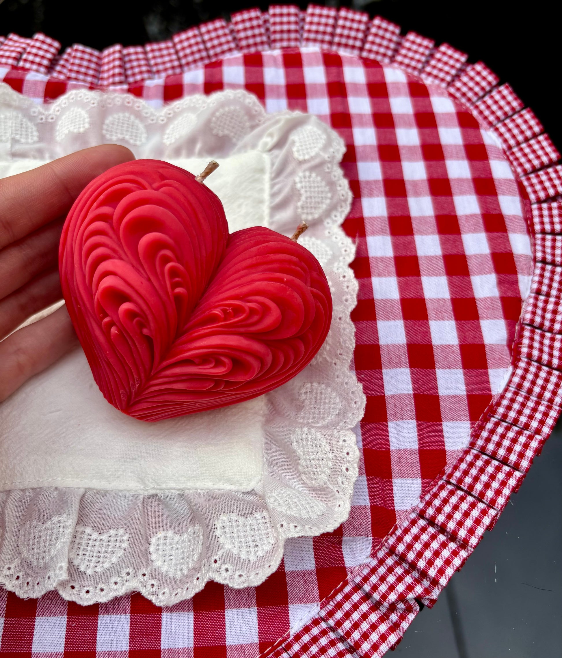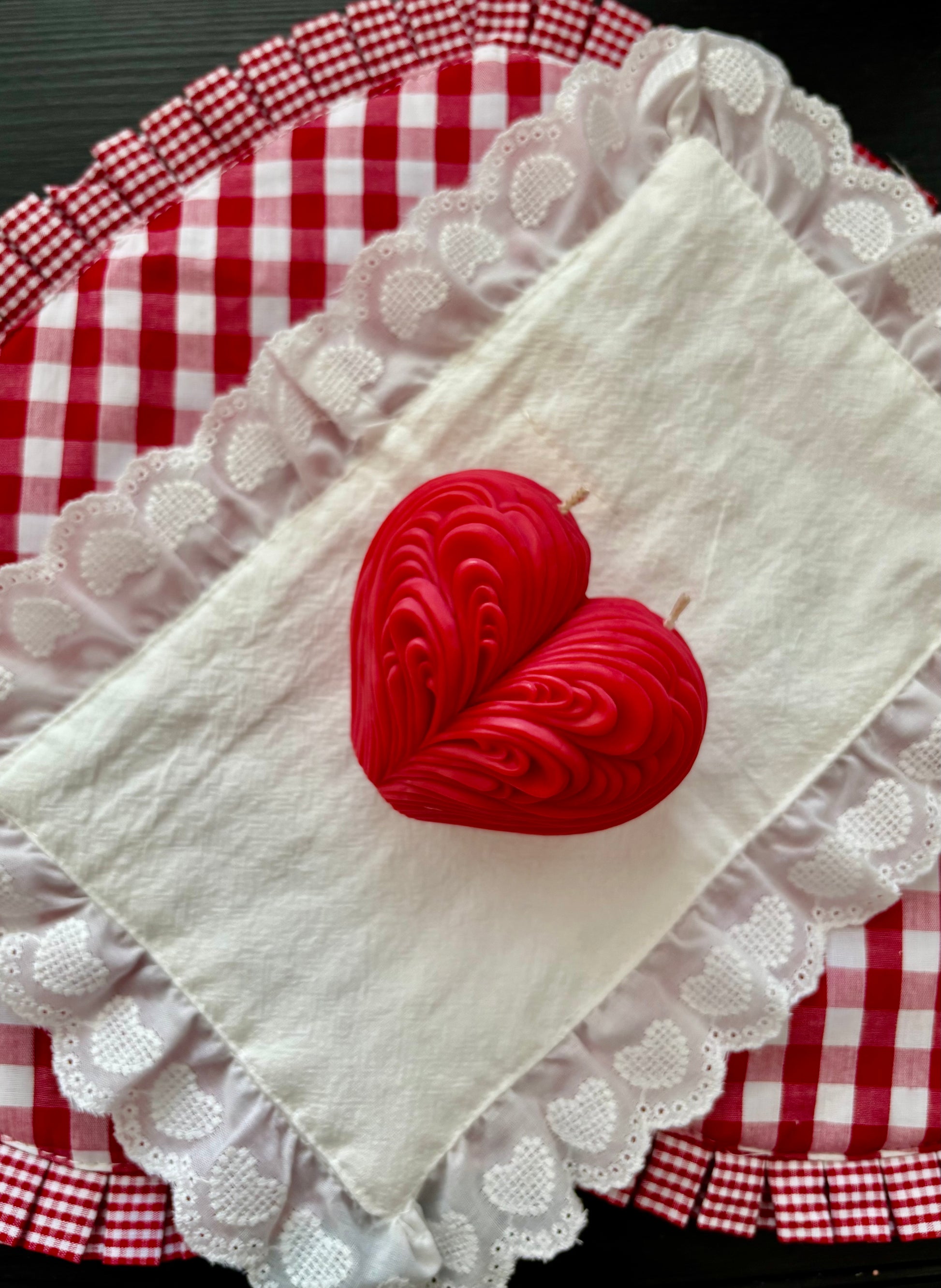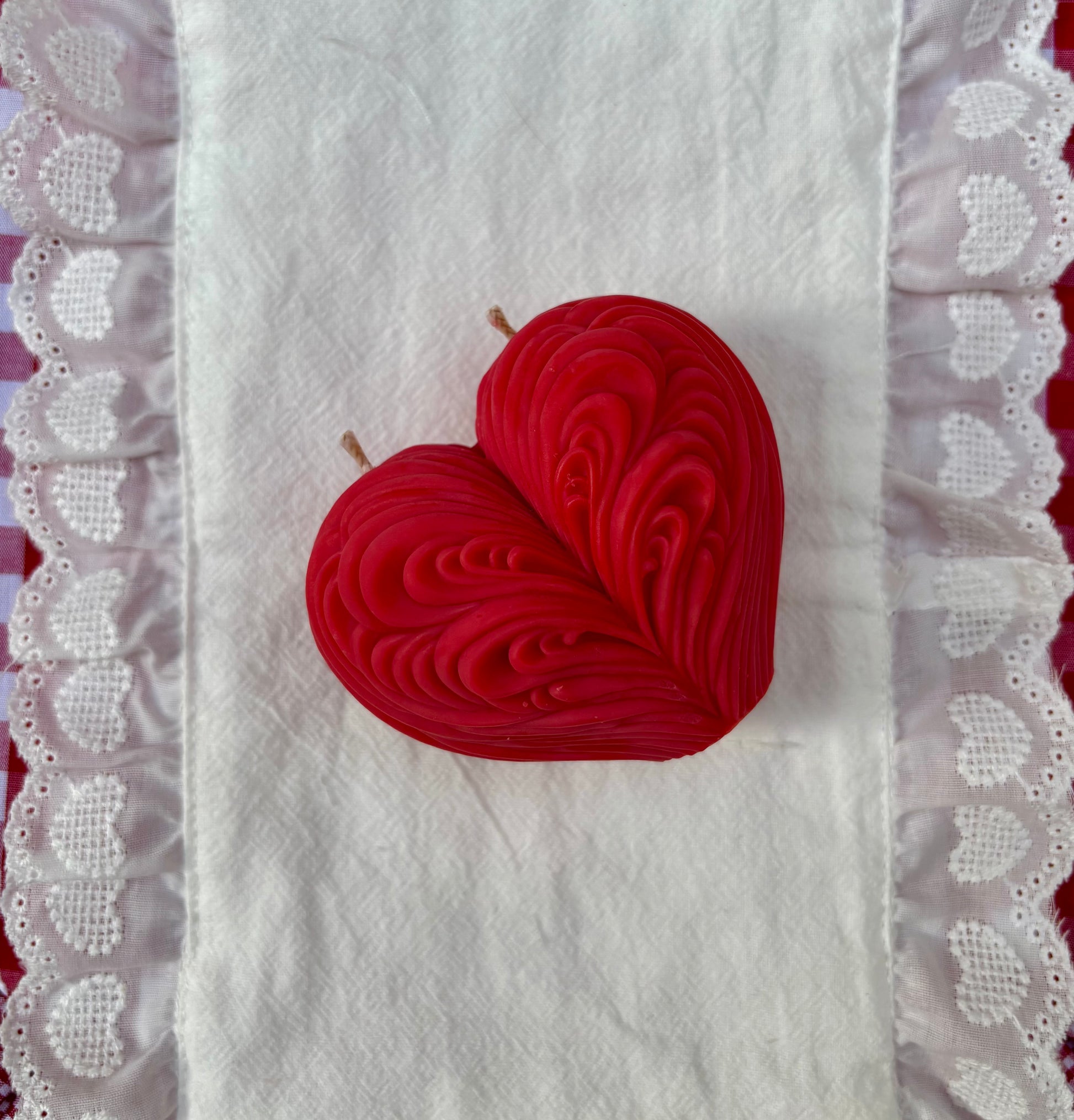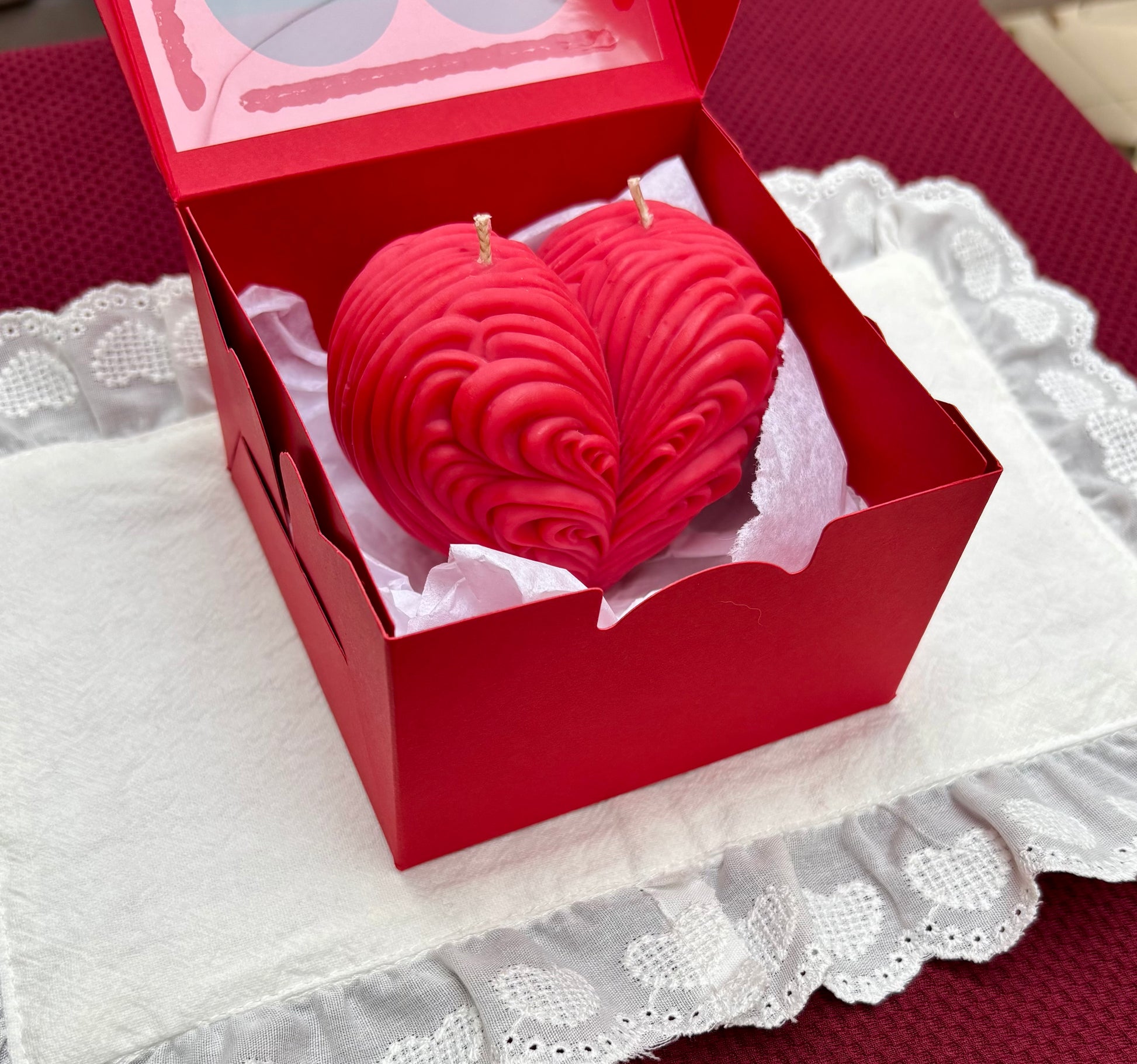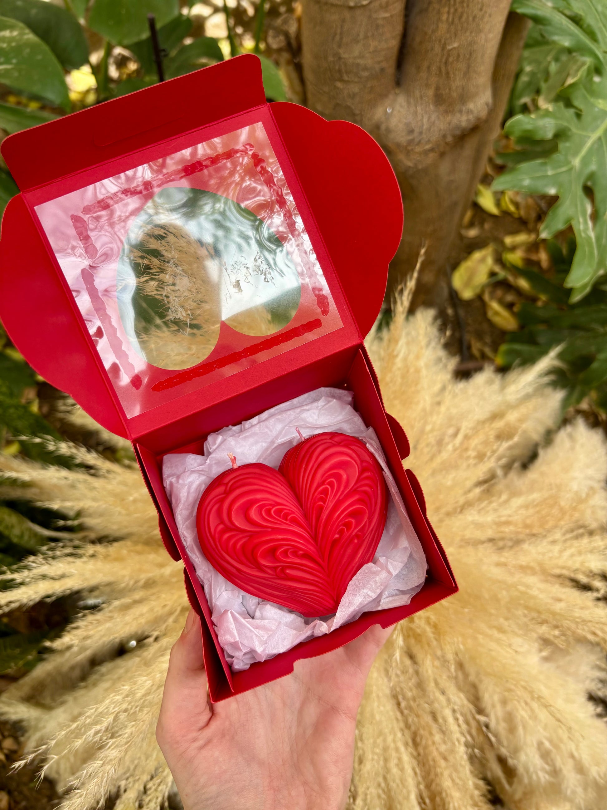 נר לב גדול ריחני עם פתיל כפול, במראה רך, תשוקתי, מתוק ומעט רטרו; מגיע בתוך קופסה אדומה עם חלון לב.